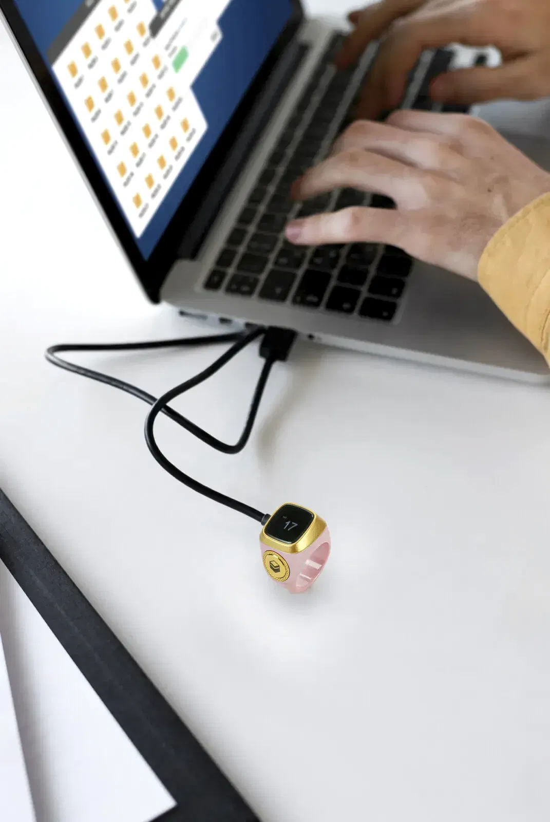 Şarj Etme :Şarj kablosunun yuvarlak ucunu Zikr Yüzüğü'nün şarj bağlantı noktasına takın ve kablo diğer ucunu güç adaptörüne veya bilgisayar USB bağlantı noktasına bağlayın.